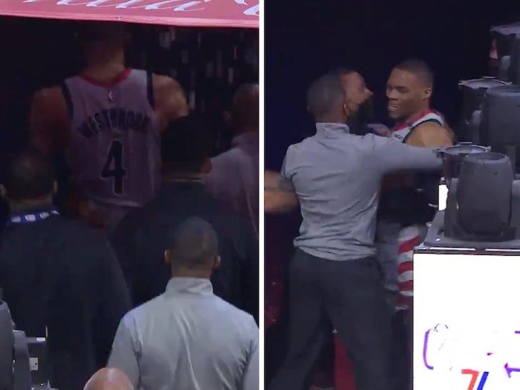 Wizards guard Russell Westbrook had to be held back by arena security staff after popcorn was dumped on his head by a fan as he exited Wednesday nights game in Philadelphia with a right ankle injury.